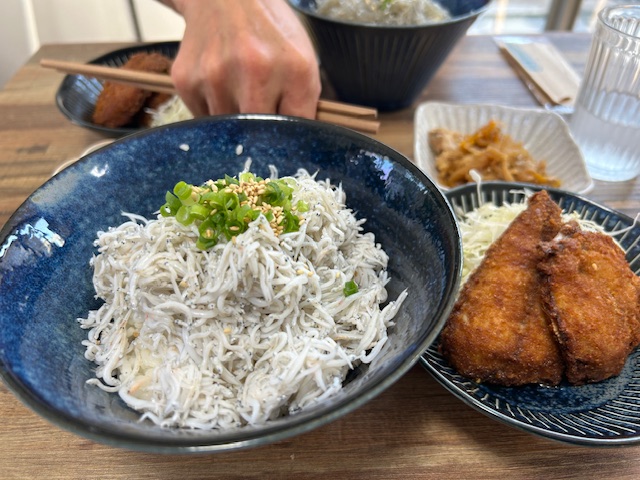 初心者プランで食べられるしらす丼を、我々もオーダーしてみました。山盛りのしらすがたまりません! 湘南で採れたしらすに魚のフライもついて、海の味わいが口いっぱいに広がります。